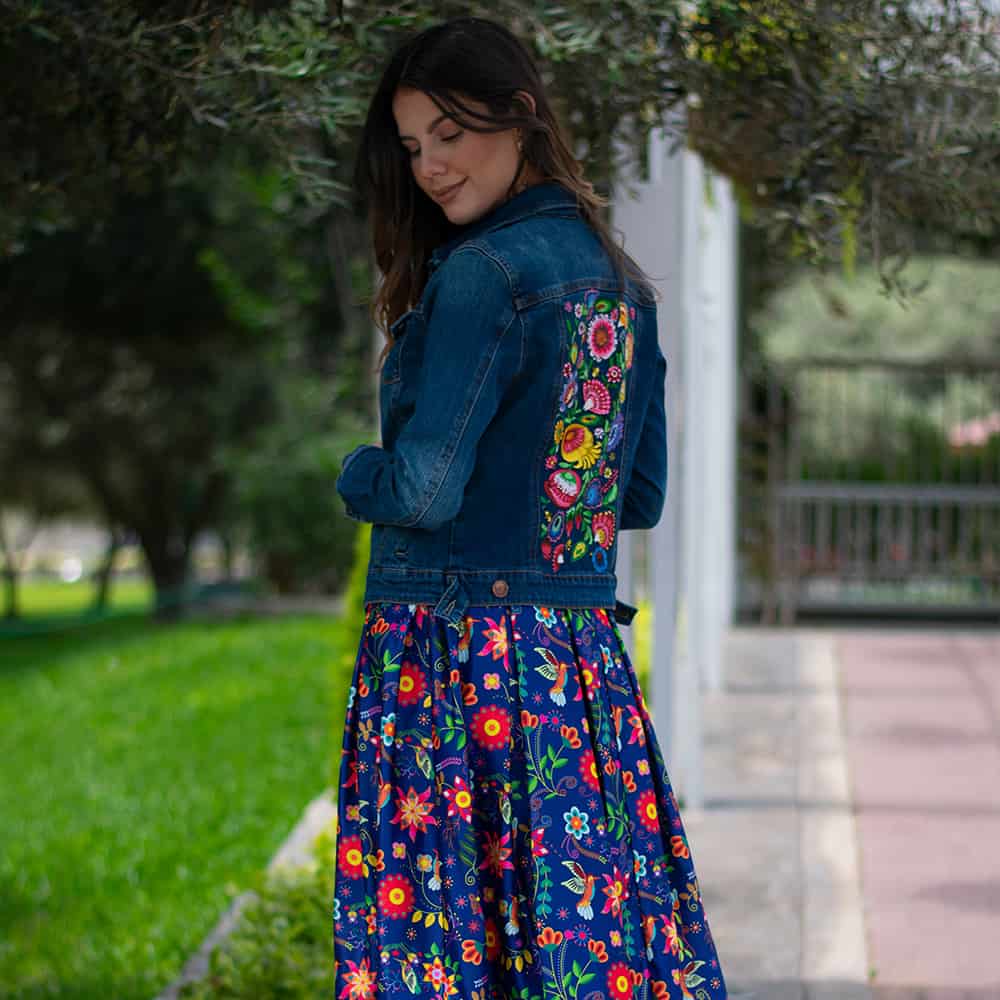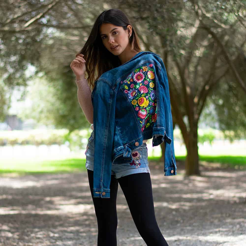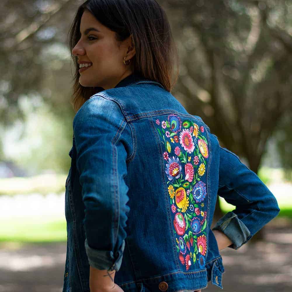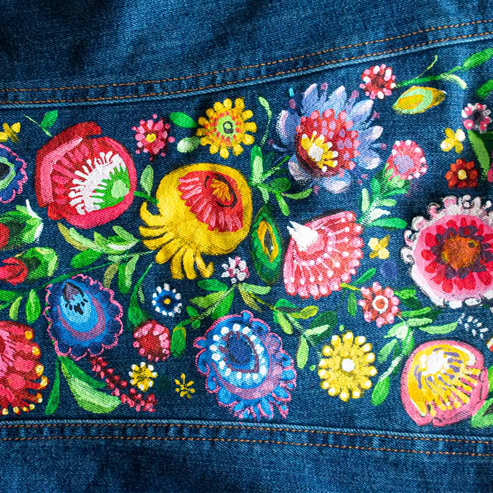 Jeansjacke aus 100% Denim-Baumwollstoff, von Hand mit Acrylfarben für Textilien bemalt.