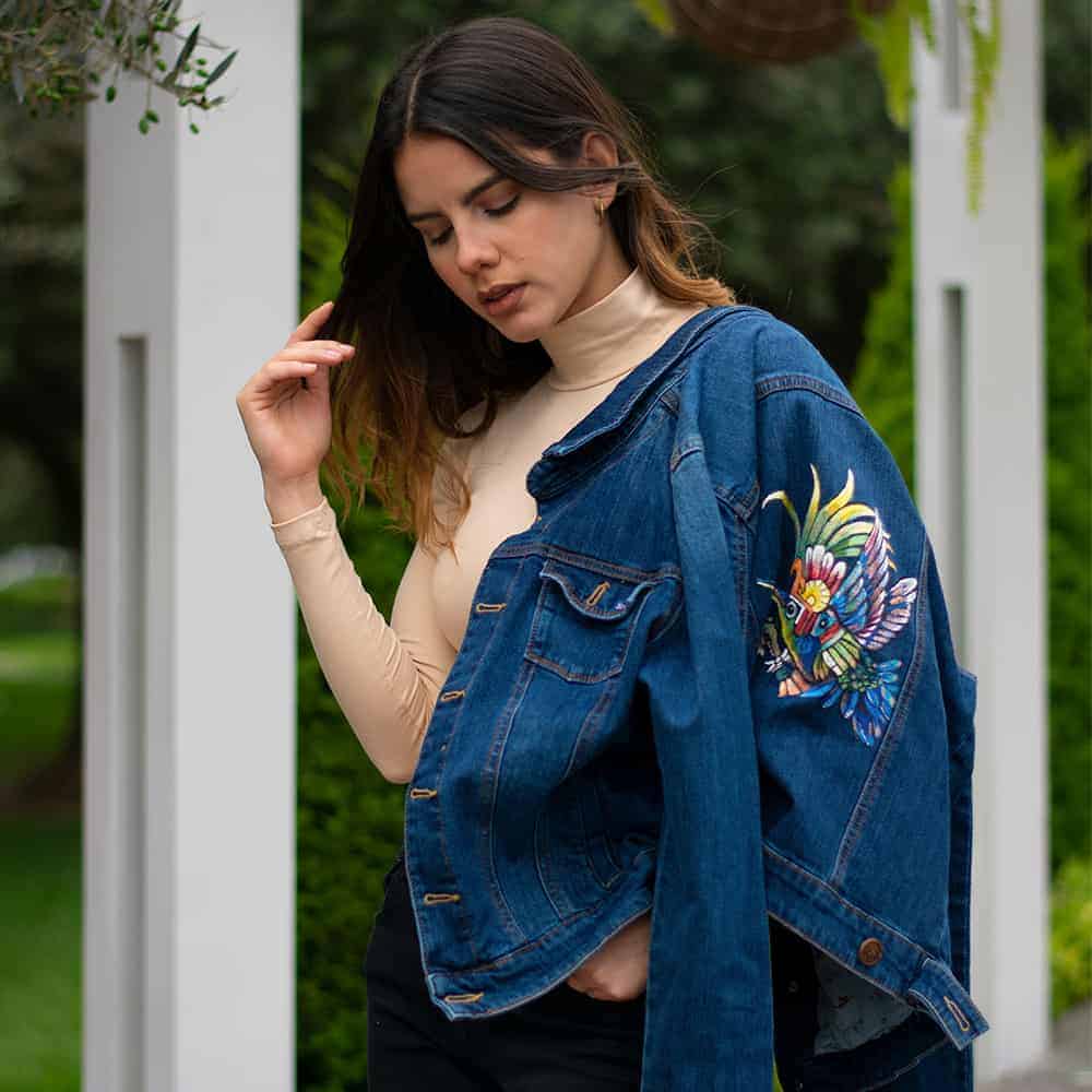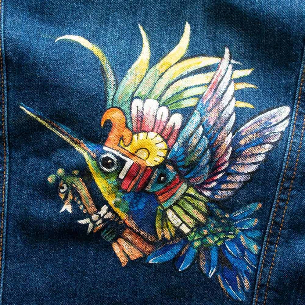 Jeansjacke aus 100% Denim-Baumwollstoff, von Hand mit Acrylfarben für Textilien bemalt.