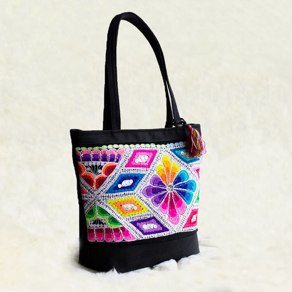 Elegante schwarze Handtasche mit schönem, handgesticktem Farbenband.