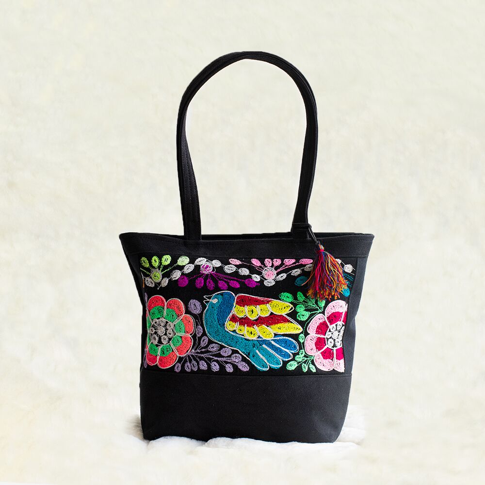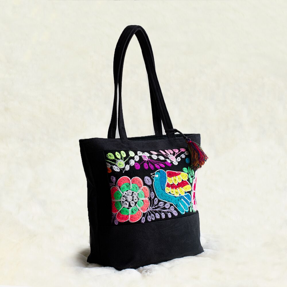 Elegante schwarze Handtasche mit schönem, handgesticktem Farbenband.